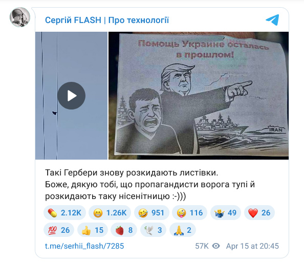 Also worth a mention: this time the enemy tried using Herber drones to drop leaflets. Defense Ministry adviser Serhii “Flash” Beskrestnov commented: