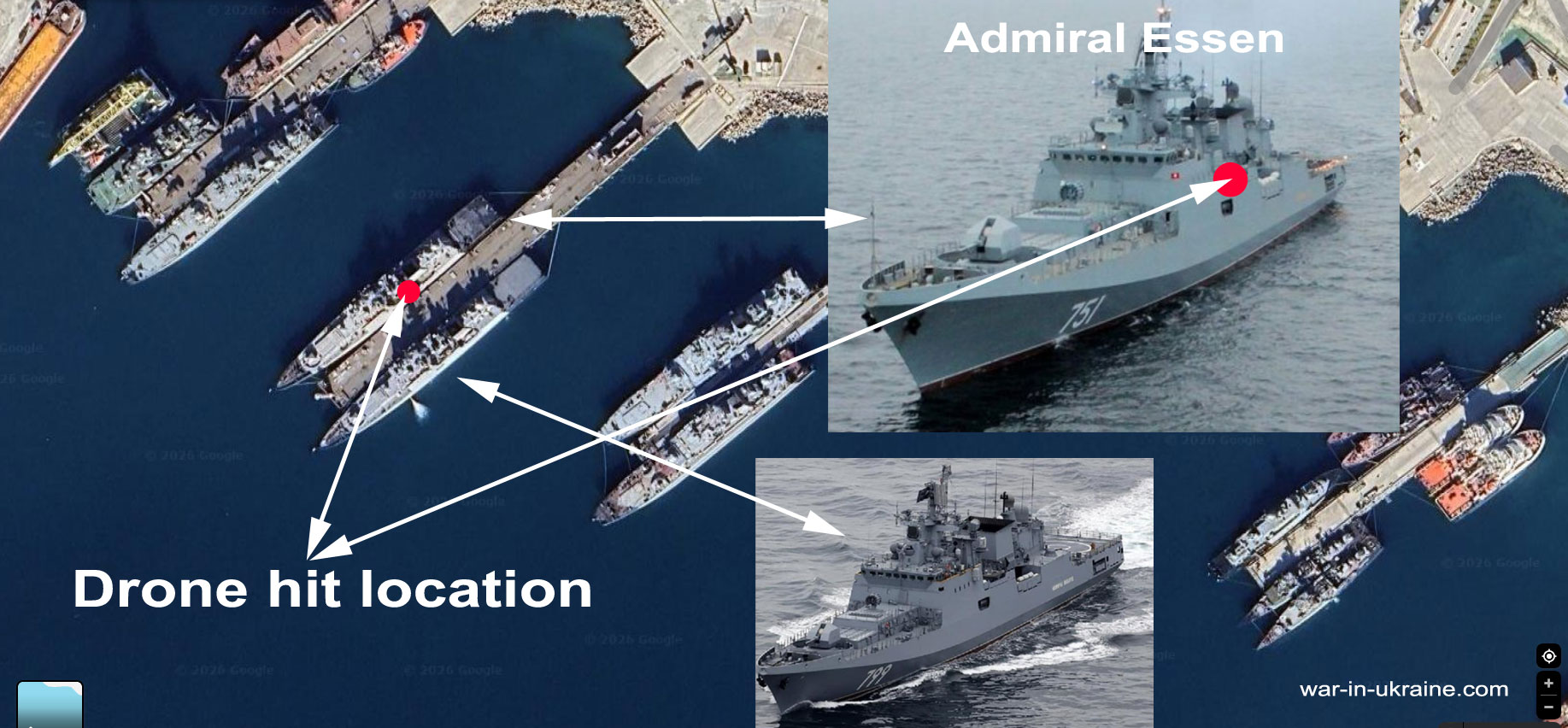 The strike caused detonation of PK-10 passive countermeasure launchers located on the superstructure sides and designed for firing chaff reflectors and heat traps. Admiral Essen was one of the 5 warships damaged in Novorossiysk that night — and among them, it carried the most firepower.