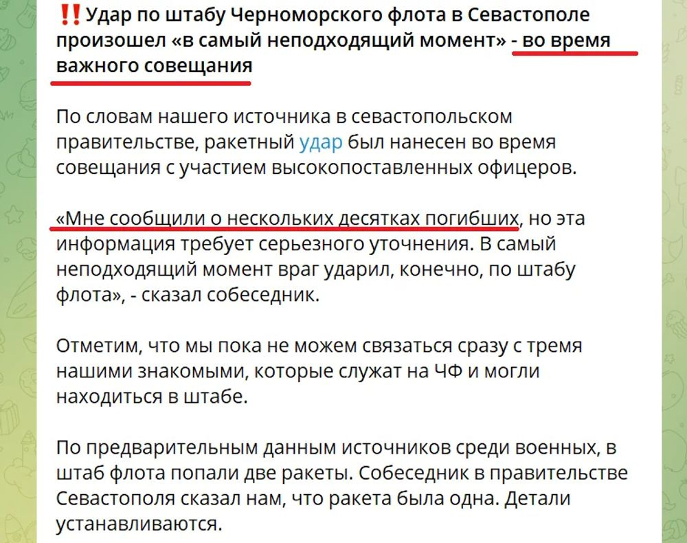 It’s worth stating plainly: the Russian Black Sea Fleet was not engaged in any naval warfare. There was simply nothing opposing it at sea. Instead, it spent its operational existence shelling civilian cities and engaging in piracy on international shipping lanes. A commander who issues those orders is a war criminal by any reasonable definition. If one of today’s missiles eliminated the commander and everyone in that room with him, that is not a side effect — it is precisely the correct outcome. And if the death of a vice admiral gets confirmed, then the AFU will have already destroyed the commander, the headquarters, the fleet command post, and the fleet flagship — every single one of them.