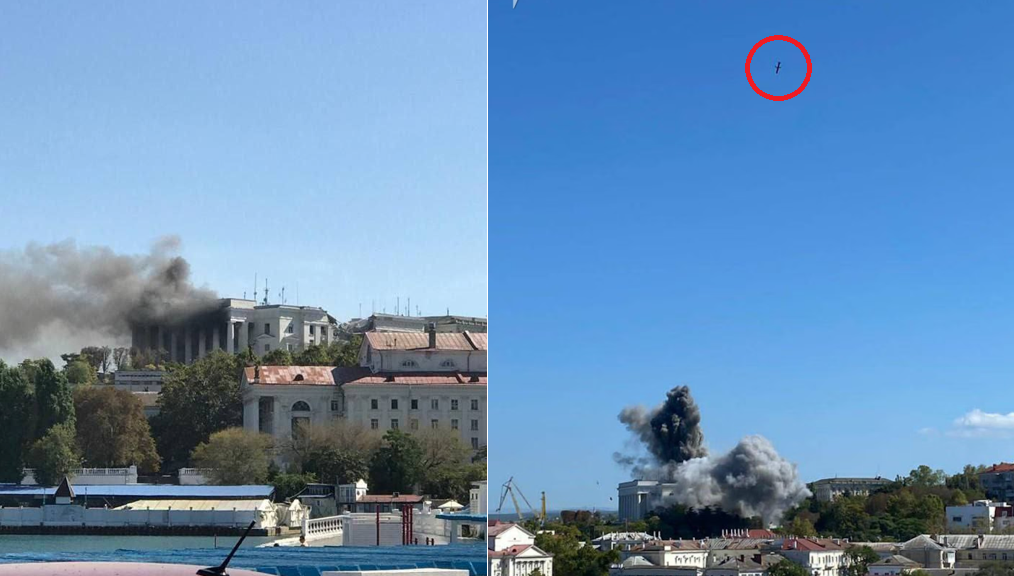 Today’s missiles found and destroyed the Black Sea Fleet HQ in temporarily occupied Sevastopol. Local residents reported at least two cruise missiles flying overhead before the explosions triggered a fire that was still burning as of 4 PM.