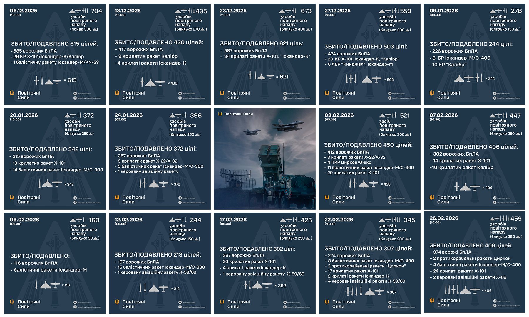 On December 6, Armed Forces Day of Ukraine, the enemy delivered one of the most massive strikes of the entire full-scale war period — 704 air targets, including 51 missiles. Subsequent attacks on December 13, 23, and 27 maintained an extremely high load level — from almost 500 to over 670 air targets.