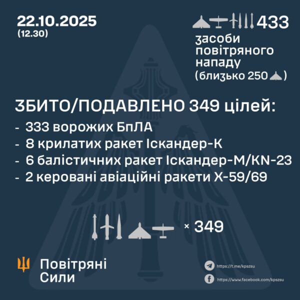By 12:30 p.m. Wednesday, the Air Force gave a report on the enemy’s night attack on the territory of Ukraine. The data has a final form only regarding missiles. At the time of the report, some number of Shaheds was still in our sky. It’s not excluded that the number of shot down and “suppressed” drones will increase.