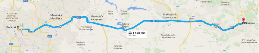 With all of this in mind, there is little doubt that the video filmed in Luhansk shows this same Volvo truck hauling a Buk missile launcher with only three, instead of four, missiles. Furthermore, we can establish that the route taken by the Volvo truck in this video was under the firm control of separatists. A July 15 convoy transporting Russian military equipment from Donetsk, Russia, through Krasnodon, to Luhansk, and eventually to Donetsk, Ukraine took that the Buk travelled on a route through Krasnodon on its way to Russia—mirroring the same route used on July 15. Lastly, both the July 15 convoy and July 18 Buk transport used the same route, Vulytsia Pavlivska-Nechuya Levytskoho, through Luhansk.