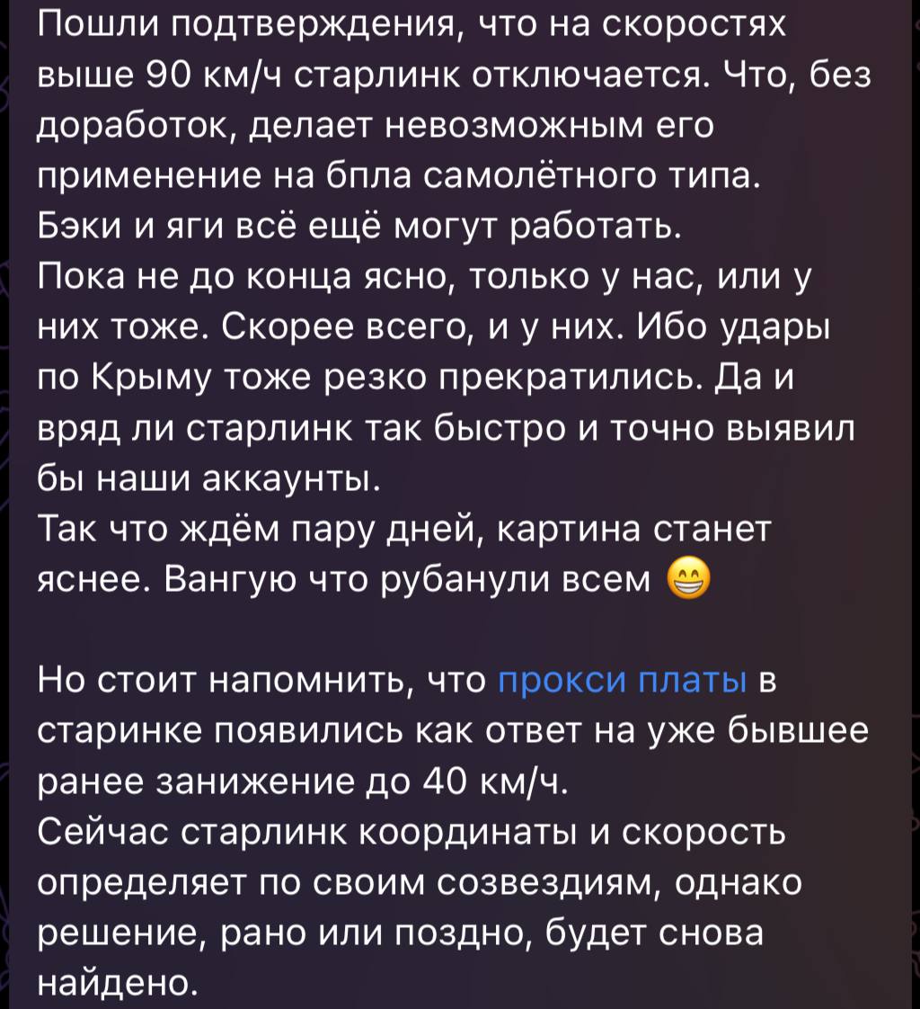 SpaceX, at Ukraine’s request, blocked the use of Starlink satellite communications by russian military for controlling strike drones used to destroy Ukrainian civilian infrastructure… Measures taken are technical in nature… for Starlink terminals used on drones, the maximum connection speed was limited to 75 km/h. Since russian drones develop speeds of 180-270 km/h, this makes communication impossible for them.