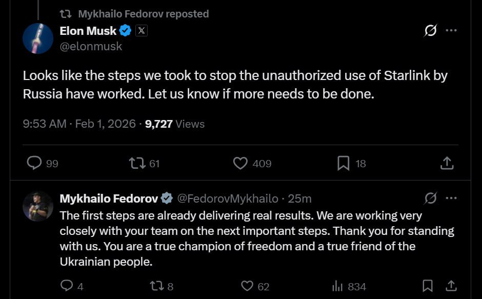 If they played it out like that — this is a grandmaster’s game. Overly detailed reasoning about blocking at certain speed confirms this. The blocking side has no need to discuss these details. Yet we see this became topic #1. Starlink shutdown on russian drones might just be the opening move in a longer game of technological warfare.