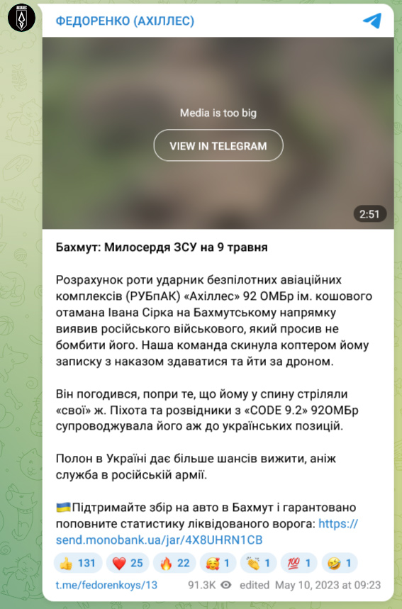 The Achilles strike UAV crew of the 92nd Brigade on the Bakhmut direction located a Russian serviceman who was asking not to be bombed. Our team dropped him a note by drone ordering him to surrender and follow it.